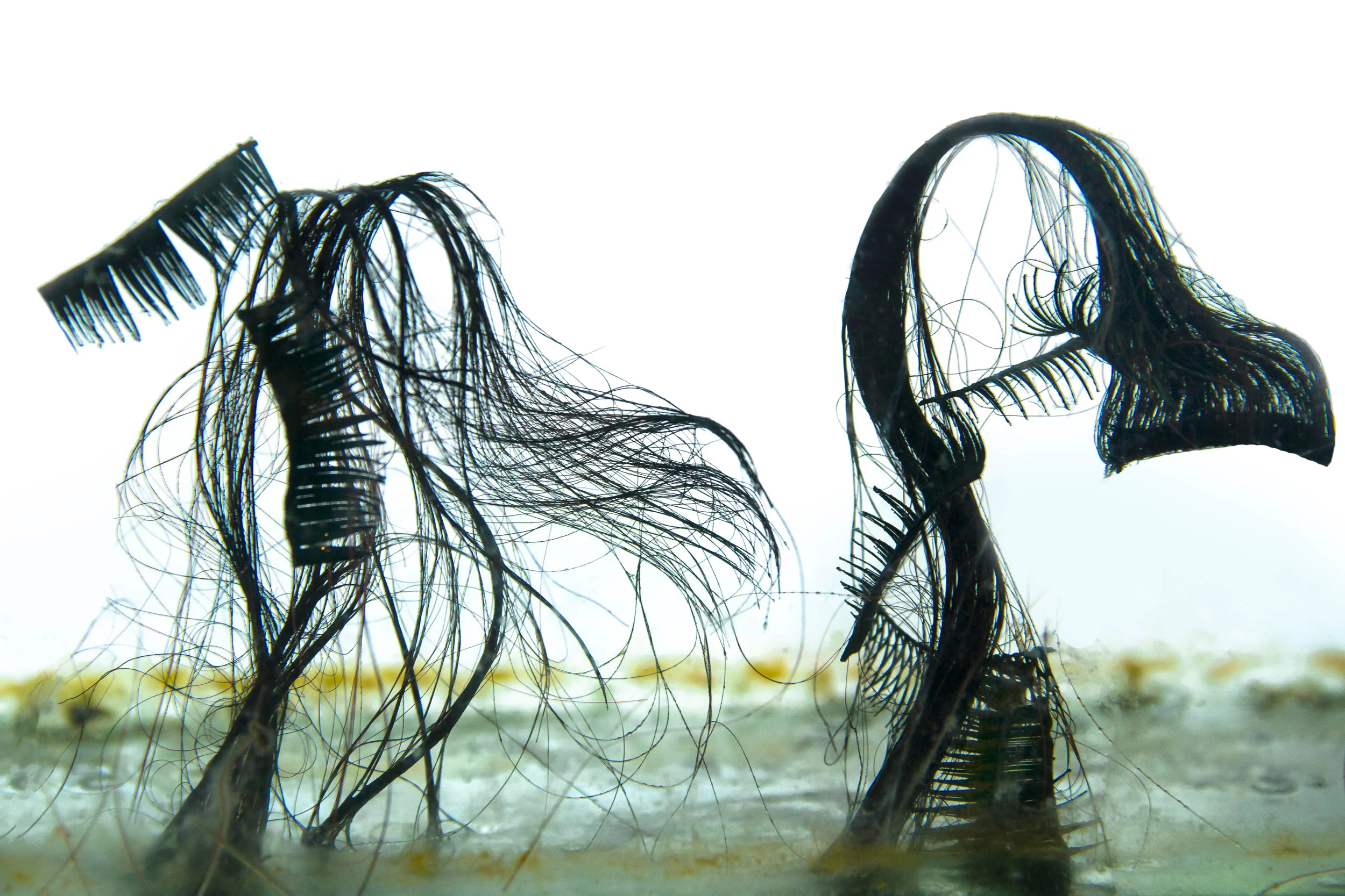 The sculpture is made from wig hair from the video shoot left in the tide to attract detritus. It picked up bits of shell, fish bones and a bracelet.