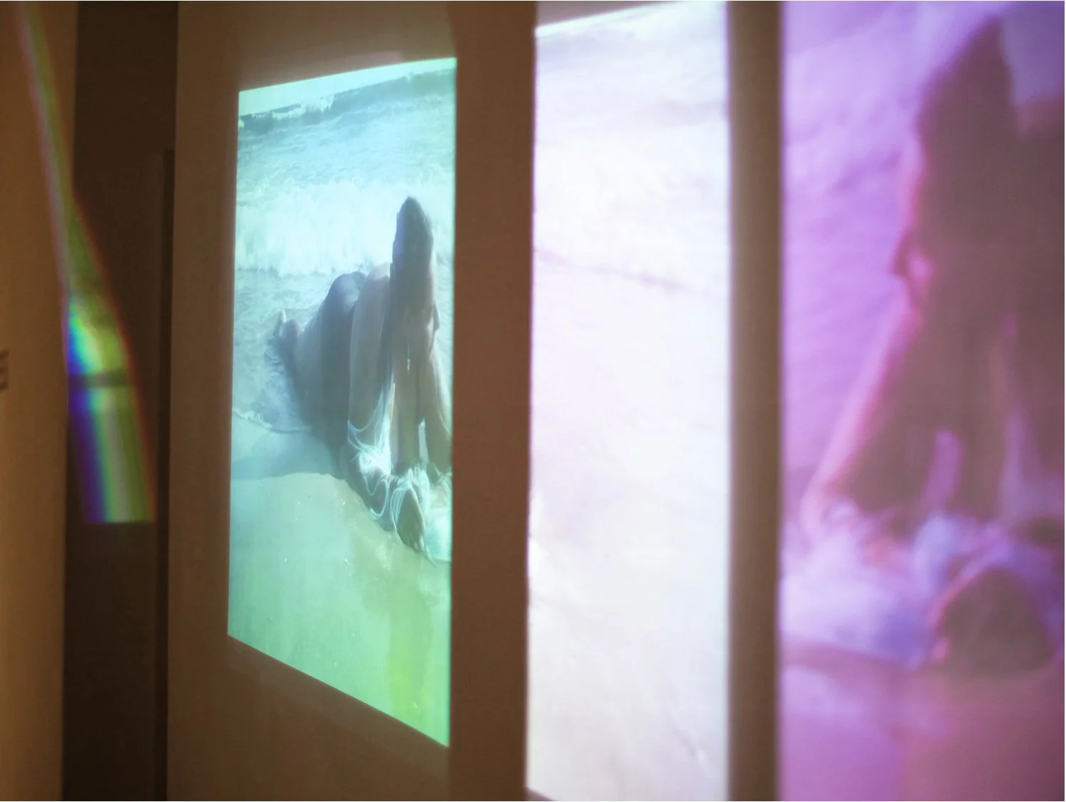 The video depicts queer artists and activists frolicking with wigs and sometimes struggling to stay upright in the tide on Riis Beach, a queer and BIPOC beach in NYC. It is projected through a tank containing saltwater, causing the light to refract and rainbow and the image to split into three color channels. The sound is made from gritty recordings captured of waves underneath the sand and a ship’s distress signal-meant to forewarn of something unknown that is to come.